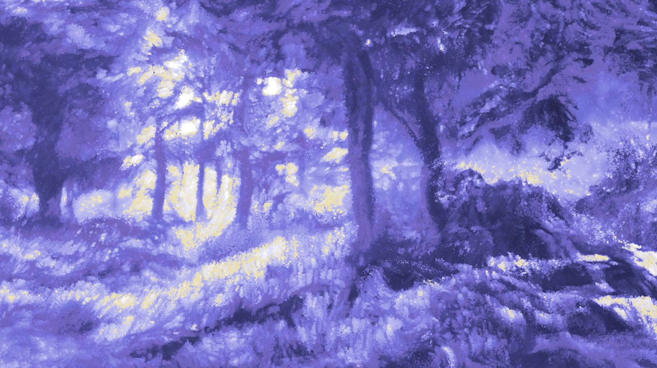 The overall vision was to envelop audiences in a positive, blue-purple glow, illustrated by meditative coral reefs, windswept landscapes, textured particle paintings, and typographic mantras—all informed by keyword descriptors inspired by the color: “Altered Landscape of Possibilities,” “Personal Inventiveness and Creativity,” and “Expansive Possibilities.”