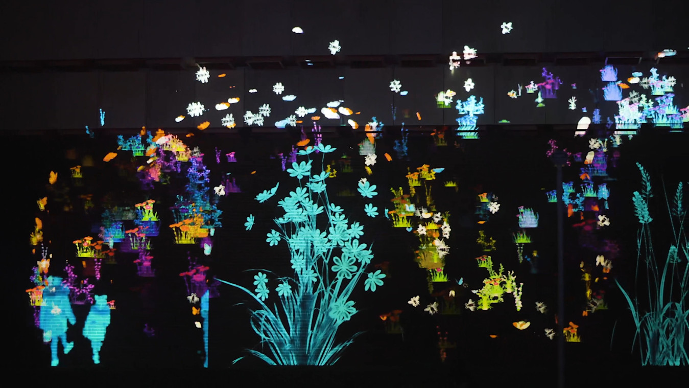 The Limbic Cinema team began with a straightforward visual objective: the audience's presence would cause plants, animals, and fungi to grow across an outdoor surface in an urban setting. They began research and development in Notch, experimenting with particle growth systems, 3D models, and images.