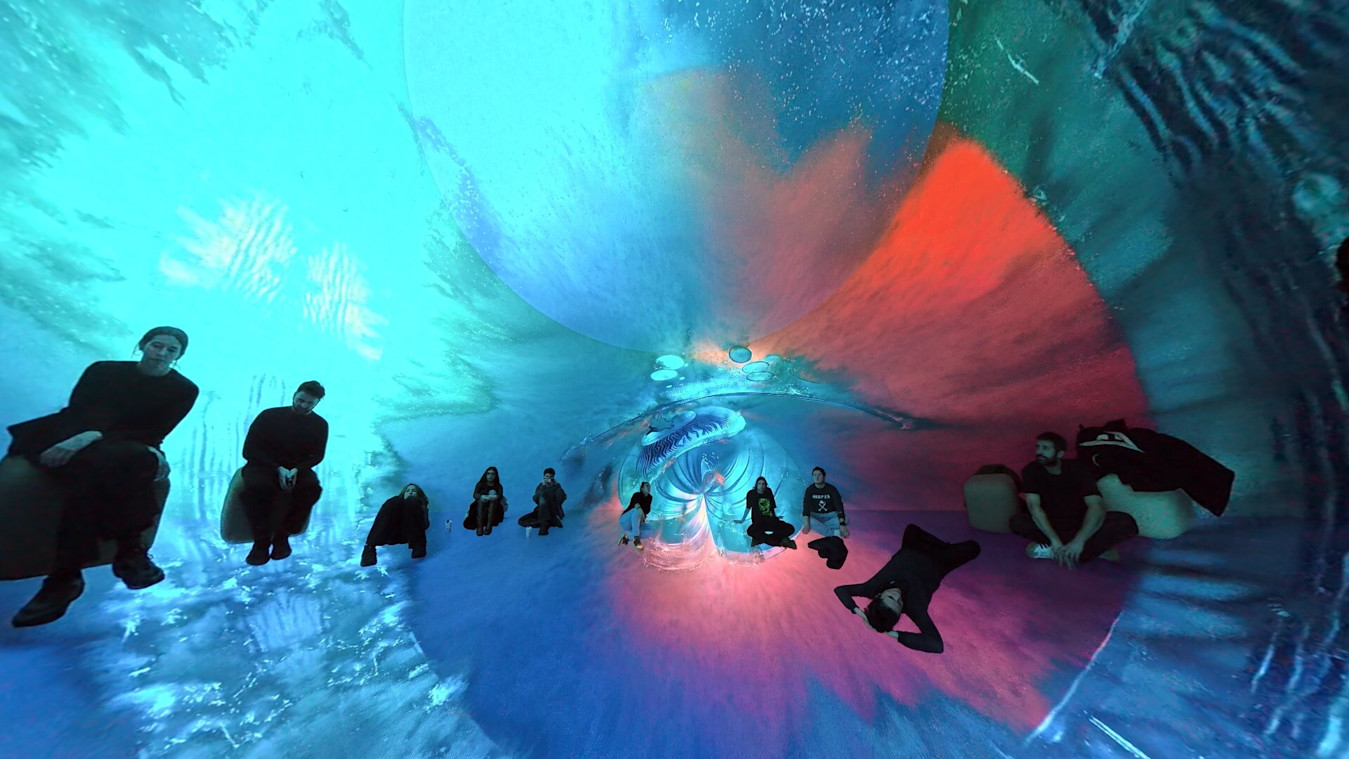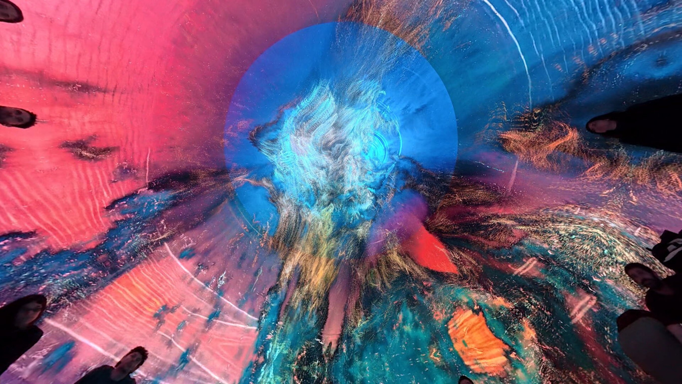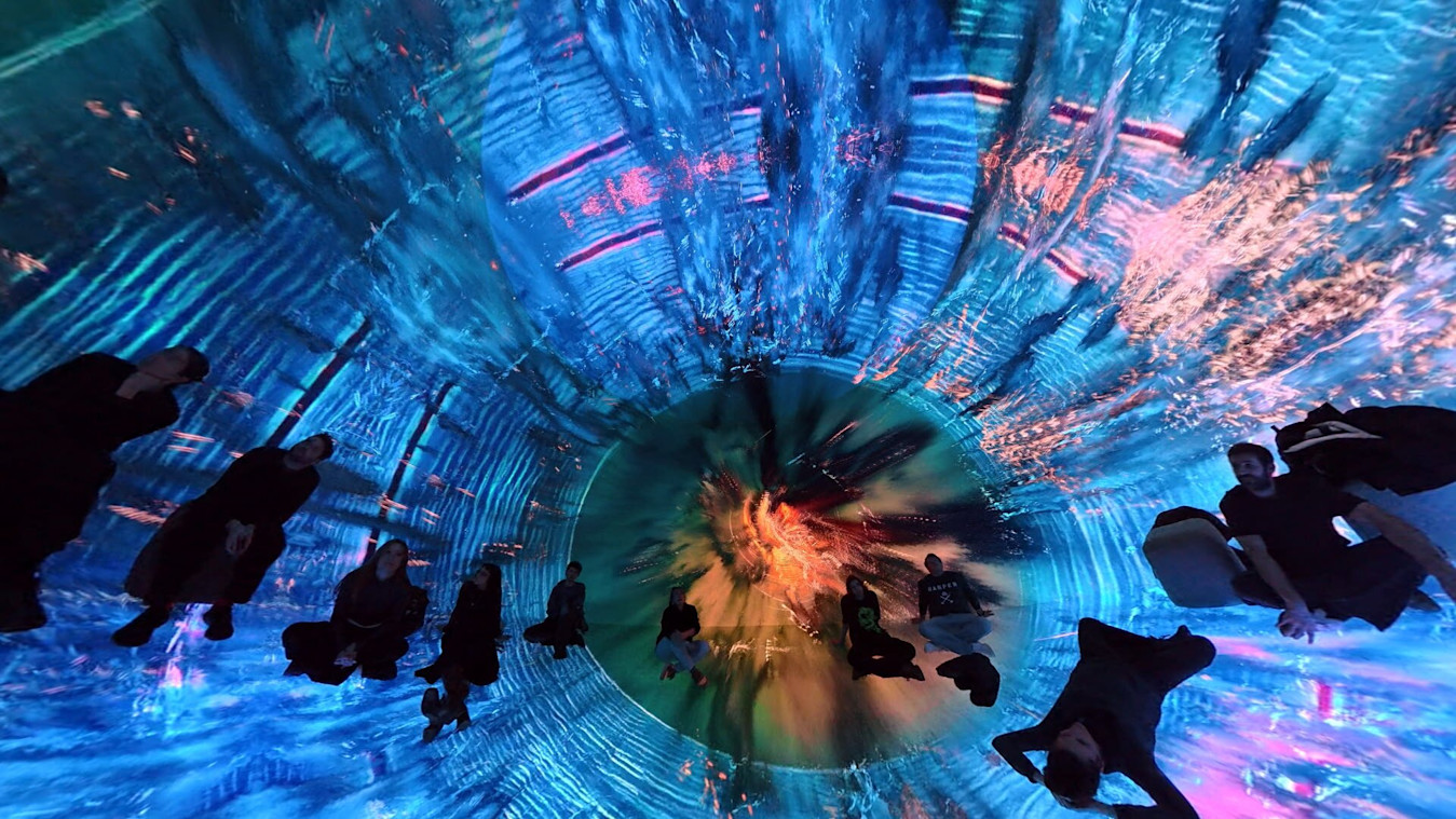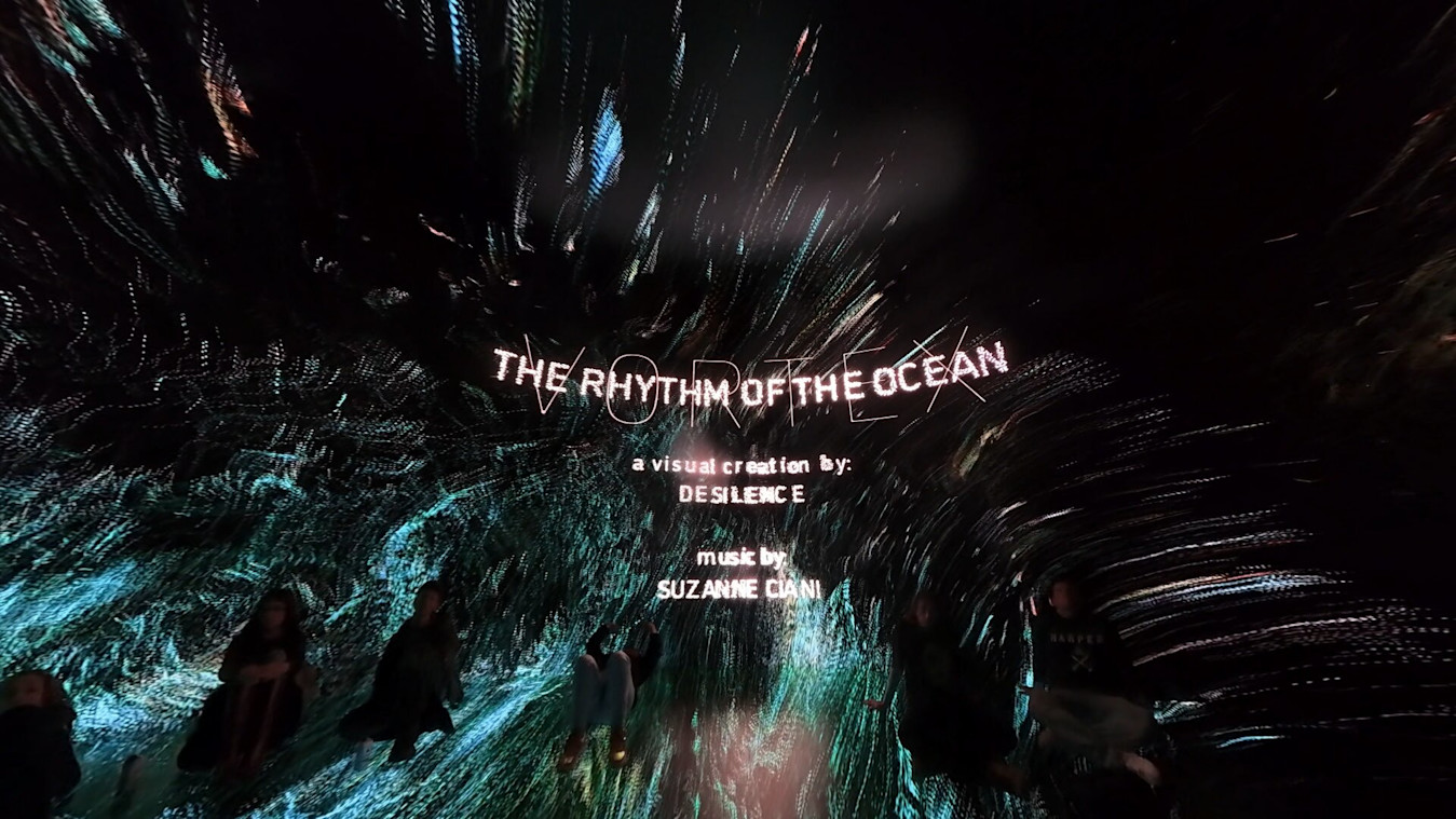 Desilence took the ocean itself as their guiding light, envisaging it as the perfect metaphor for immersion. They brought a workstation and began experimenting directly in the space, exploring how the fulldome and mapping versions of the project could work in a cylindrical format. The piece evolved through hands-on testing, letting the architecture and immersive conditions of the Vortex guide the work’s transformation.