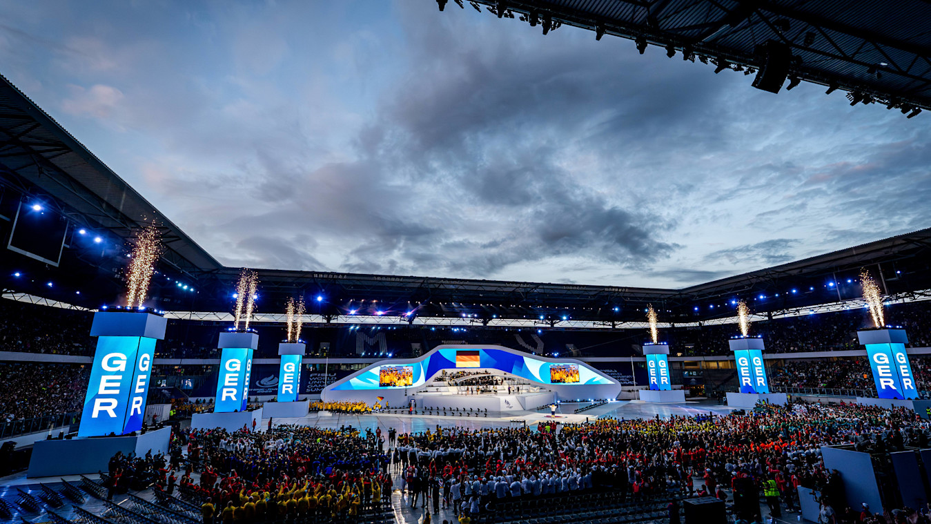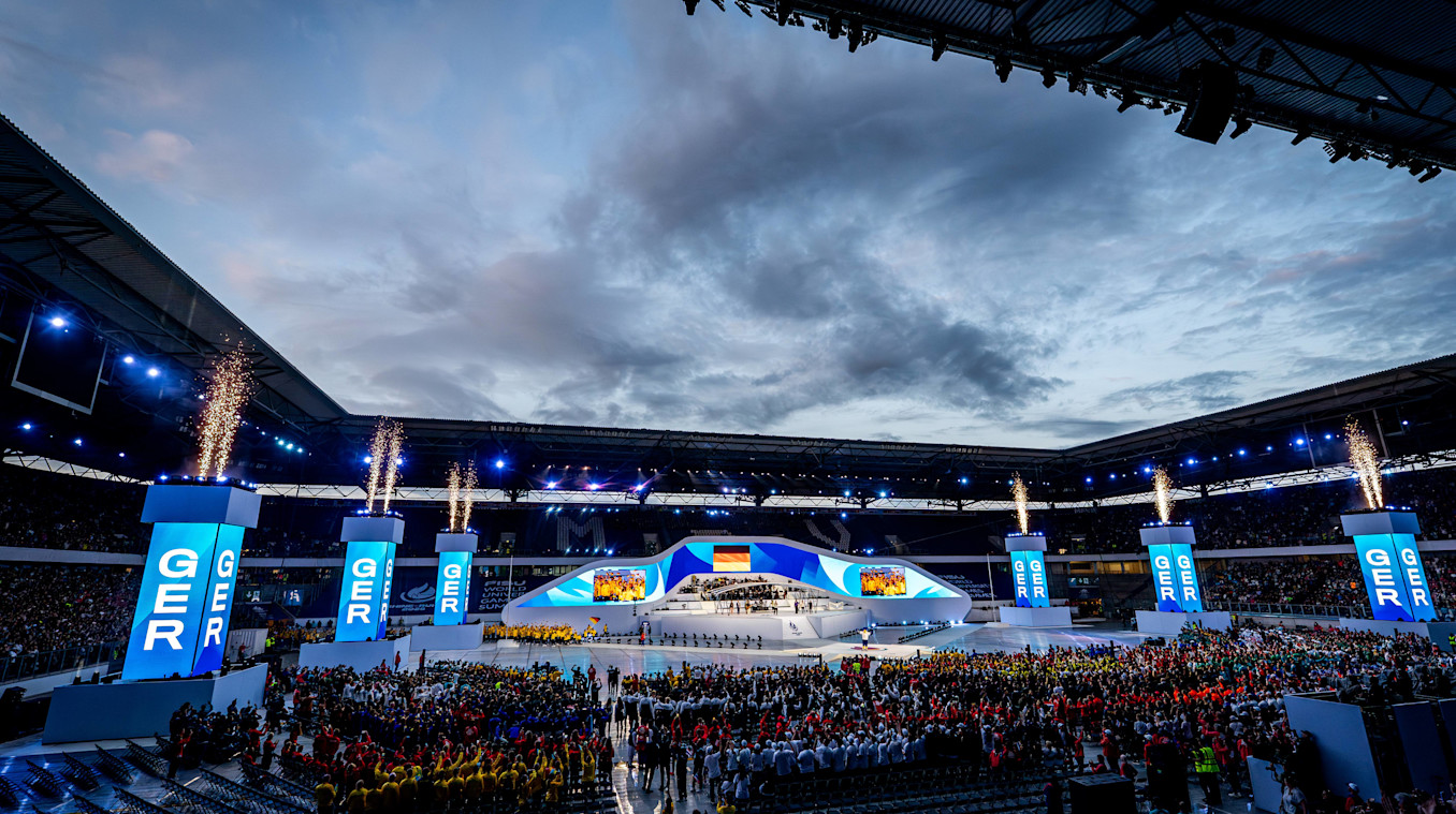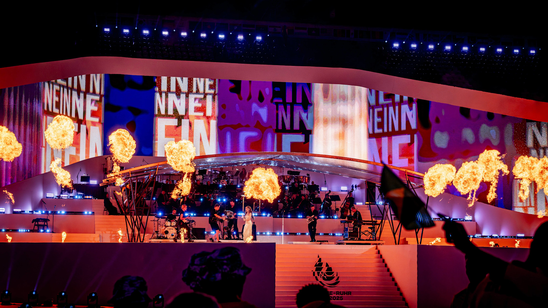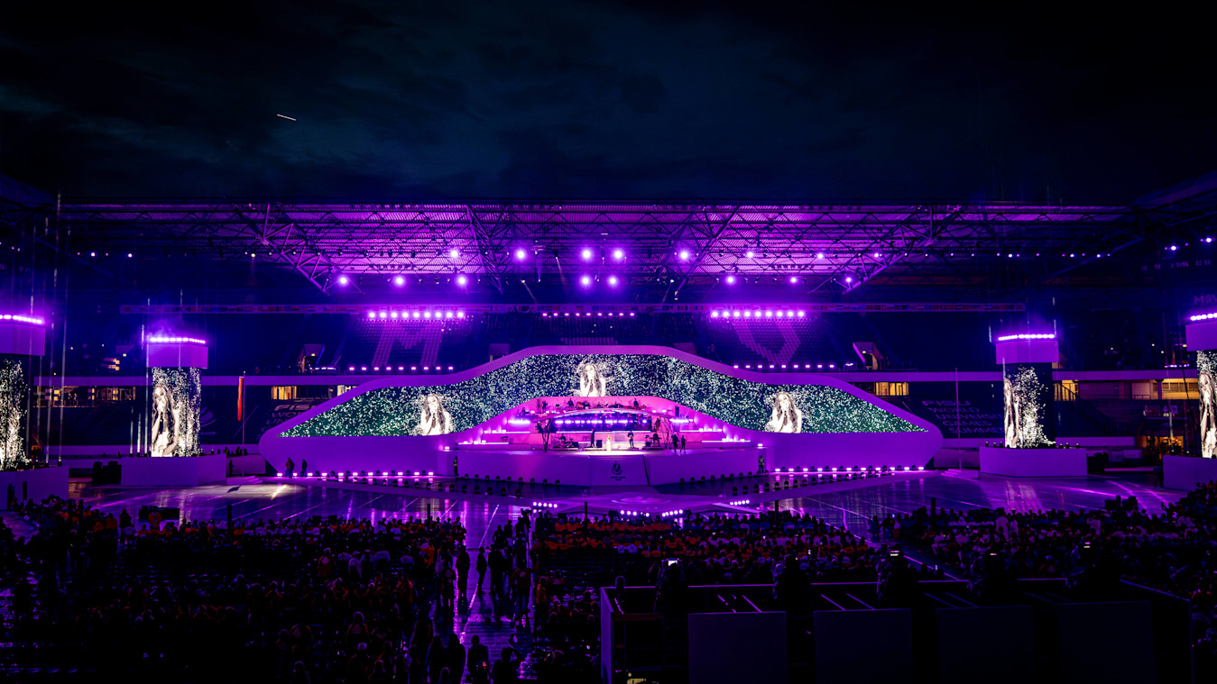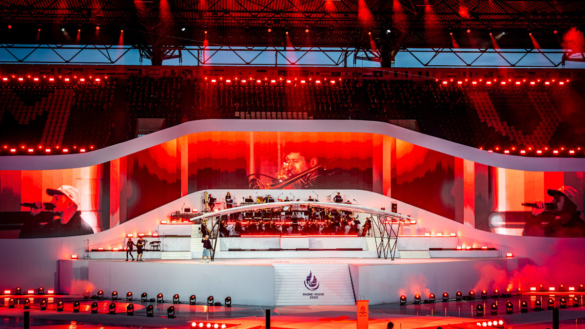 The Rhine-Ruhr Games and Show Concept Creator Hans Mücke approached Gerdon Design to design and deliver a full visual concept for the opening ceremony of the Summer 2025 edition of the FISU World University Games, one of the largest multi-sport events worldwide. The Games organisers tasked Gerdon Design with developing pre-rendered backgrounds to play throughout as well as six unique real-time sequences to accompany featured musical acts, integrating live camera feeds over a canvas comprising a massive 13,500-pixel-wide LED wall and six infield towers.