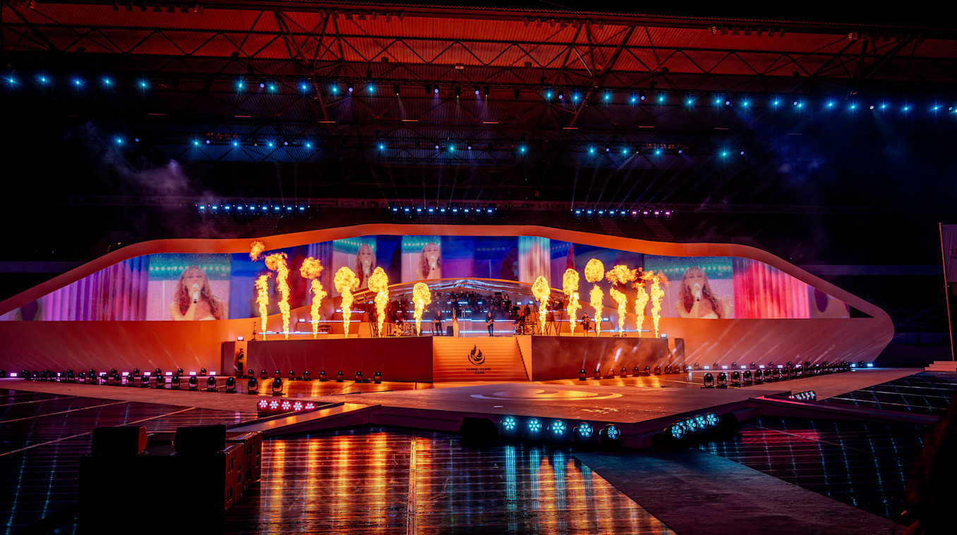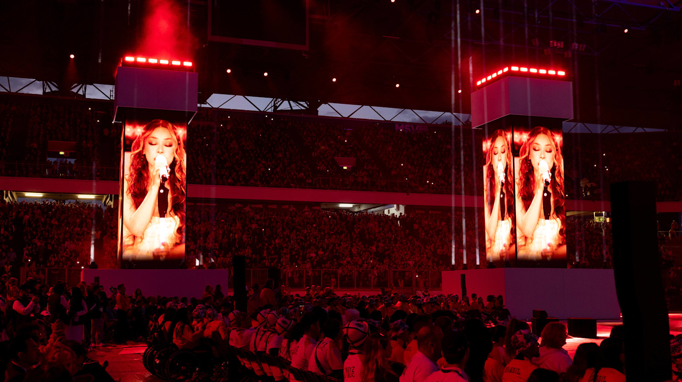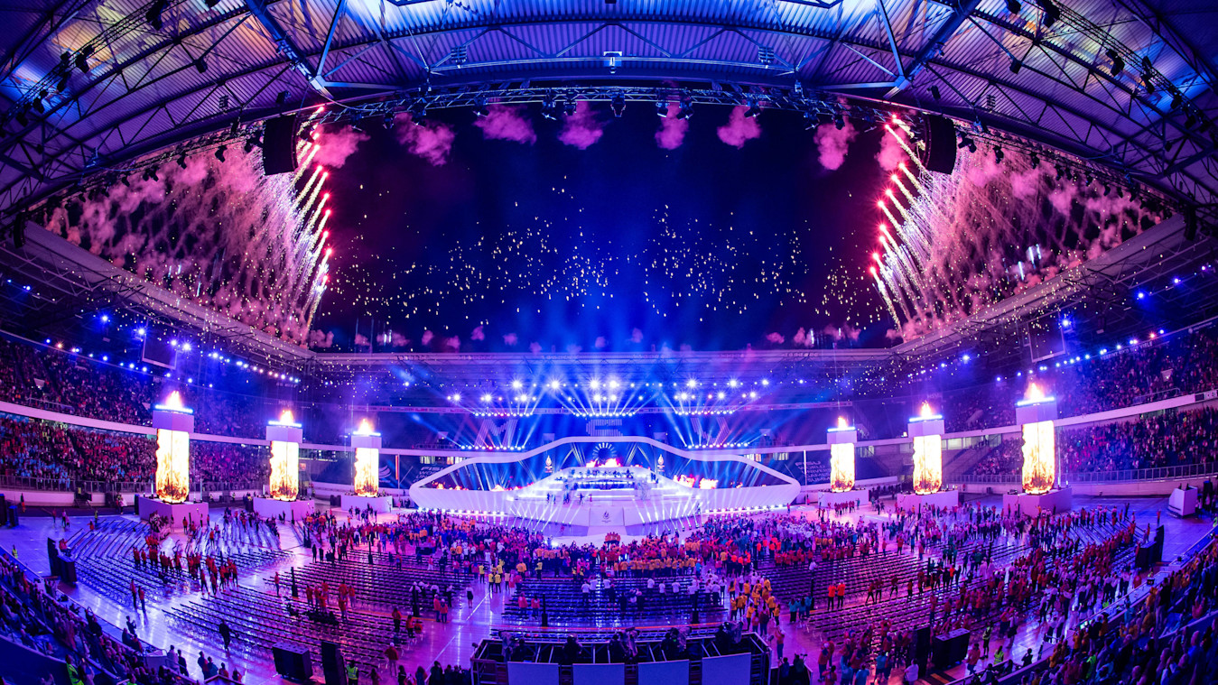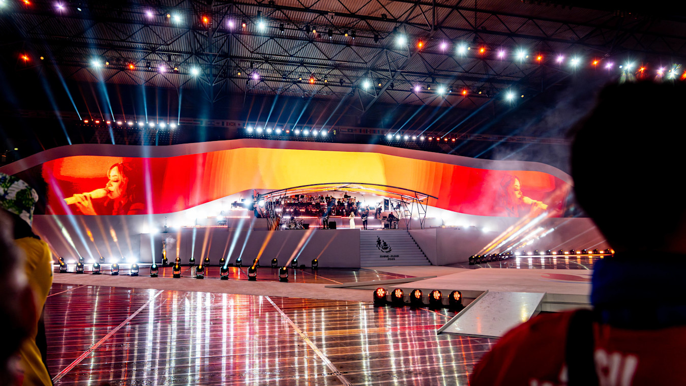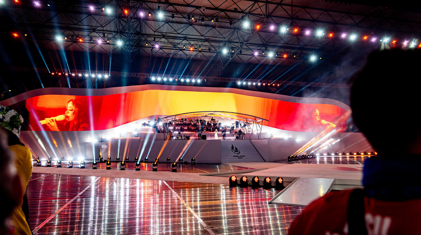 The Rhine-Ruhr Games and Show Concept Creator Hans Mücke approached Gerdon Design to design and deliver a full visual concept for the opening ceremony of the Summer 2025 edition of the FISU World University Games, one of the largest multi-sport events worldwide. The Games organisers tasked Gerdon Design with developing pre-rendered backgrounds to play throughout as well as six unique real-time sequences to accompany featured musical acts, integrating live camera feeds over a canvas comprising a massive 13,500-pixel-wide LED wall and six infield towers.