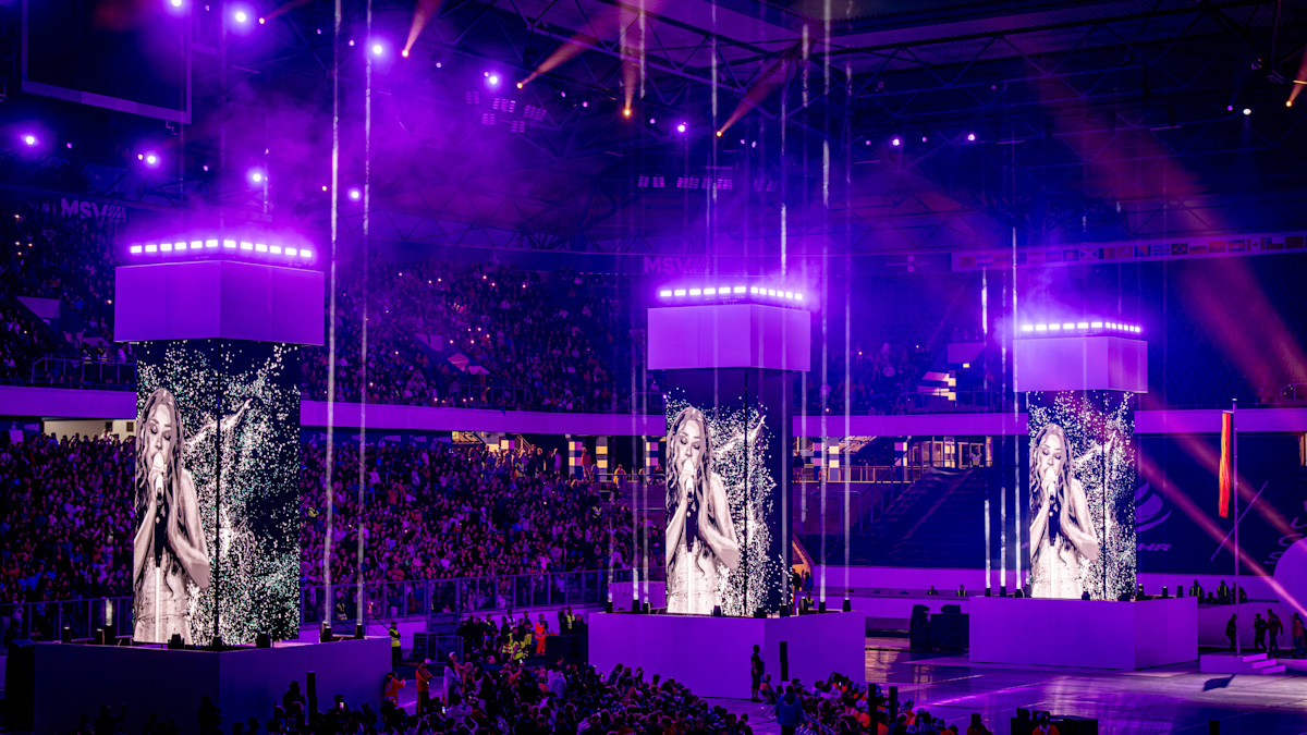 The Gerdon Design team set out to craft bold looks that complemented the onstage performances, with a specific focus on placing each artist at the centre of their own visual world. Collaborating with Cologne-based Clubkind Design, they used Notch 1.0 to create widescreen scenes built around the camera feeds, incorporating the perspectives of the artists, orchestra, and band. The palette ranged from gradient colour fields separated by vertical lines to glass-like fragments with raindrops that enveloped and transformed the stage atmosphere. They also went heavy on the particles, designing a field influenced by each artist’s unique movements.