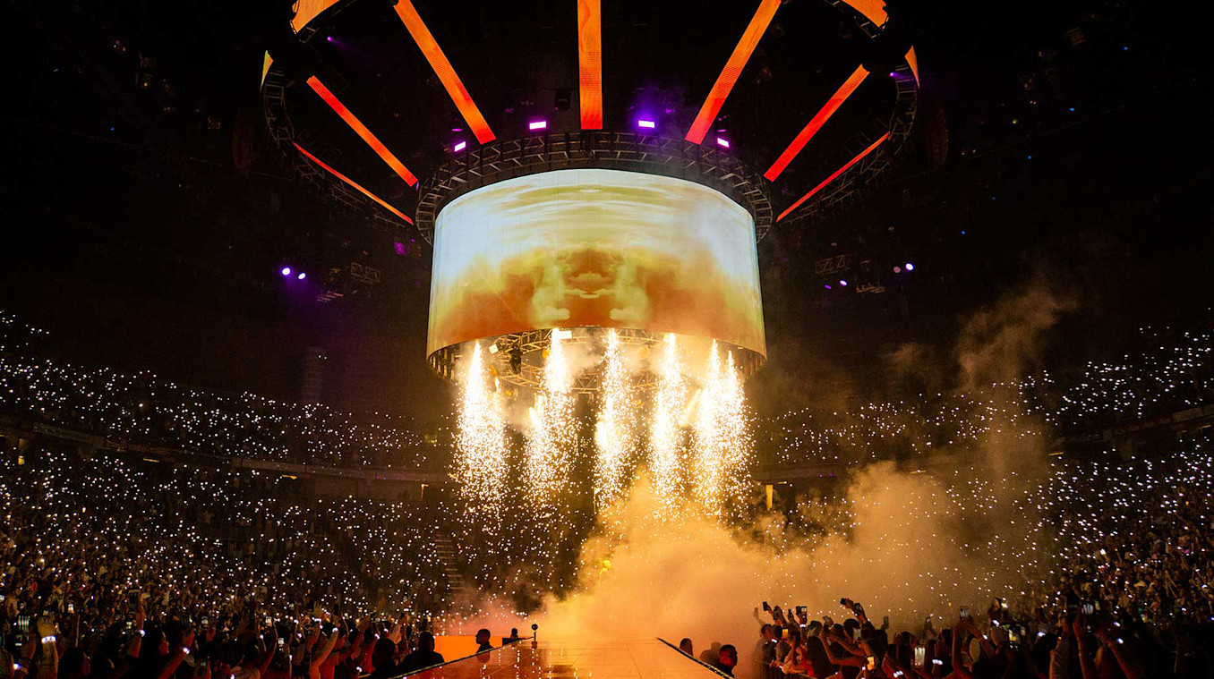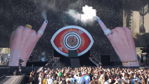 Tanner: “This show has a lot of LED screens all of different shapes and sizes. We were able to stack content for different screens Using Notch’s UV Camera with NDI streaming. Stacking was essential for the eight vertical screens hovering above the stage. We also introduced a custom eye-shaped screen for Coachella. We used rendered and live custom content for this screen to create a seamless look.”