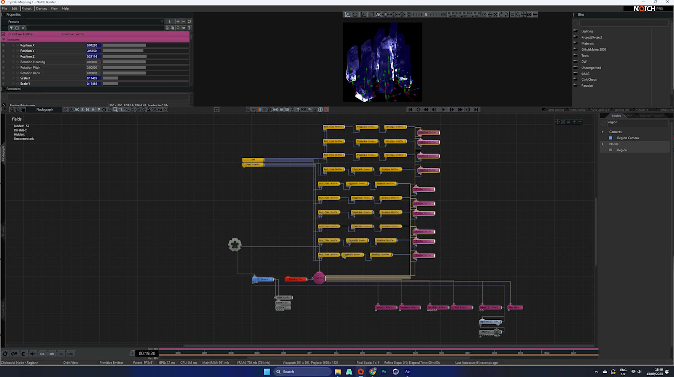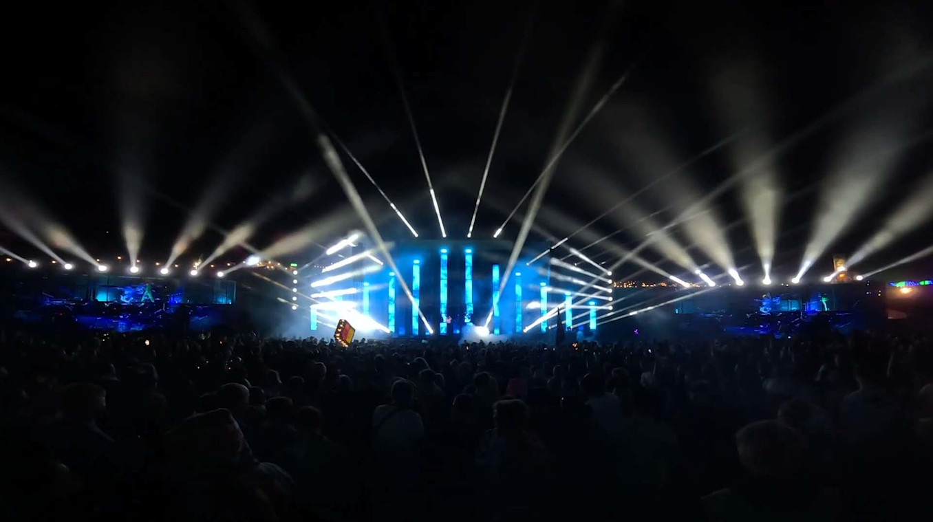 The festival asked the team to use the stage’s tremendous pillars to guide their creative decisions with the goal of emphasising their size. The team used a combination of Notch, TouchDesigner, and Resolume. The primary visuals were a variety of shapes generated in TouchDesigner that moved up and down the confines of each pillar, pushed through a Notch Block to add particle and field systems and a general glitch effect that unified the varying material. On top of controlling things like colours and particle speeds in real time, Notch Designer and Video Producer Daniel Williams could also gradually add and remove individual particles, resulting in something more refined than a pre-rendered fade.