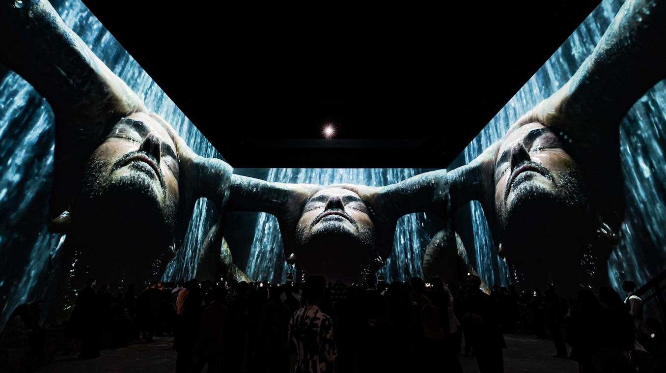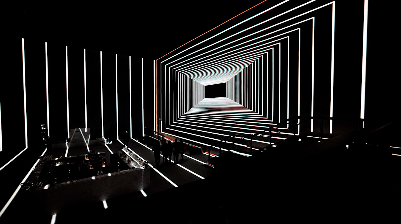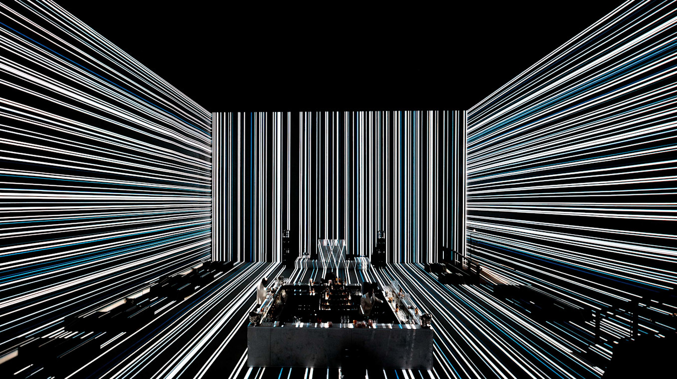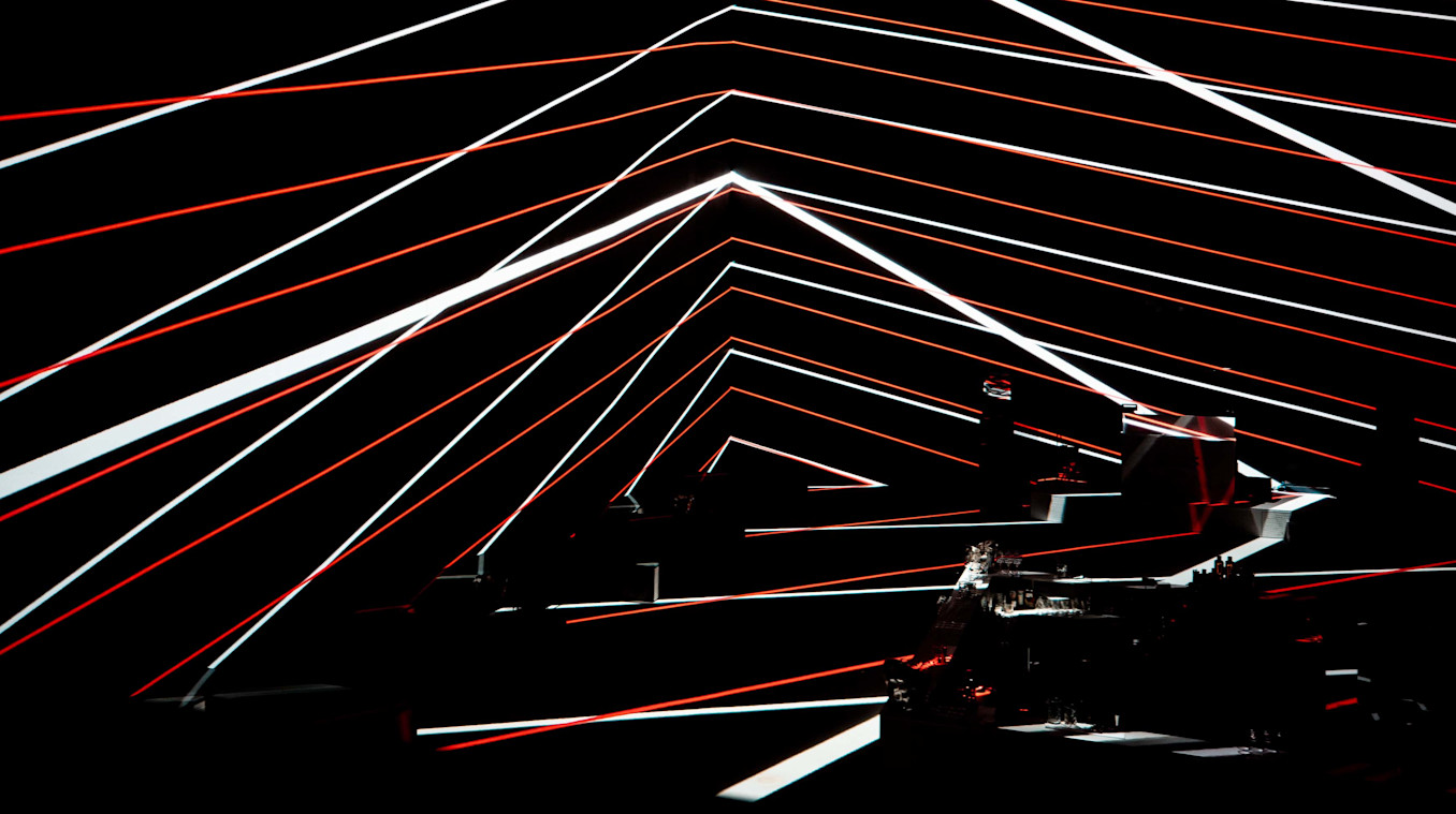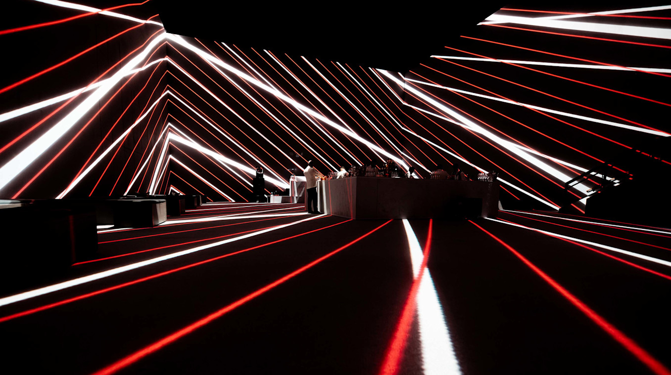 Using Lightroom’s full 360 degrees of screens for their projections, the immersive-me team designed an audio-reactive environment echoing the film’s NYC apartment-block setting. The creative team used light spilling through “windows” and curtain-shrouded silhouettes to envelop attendees.
