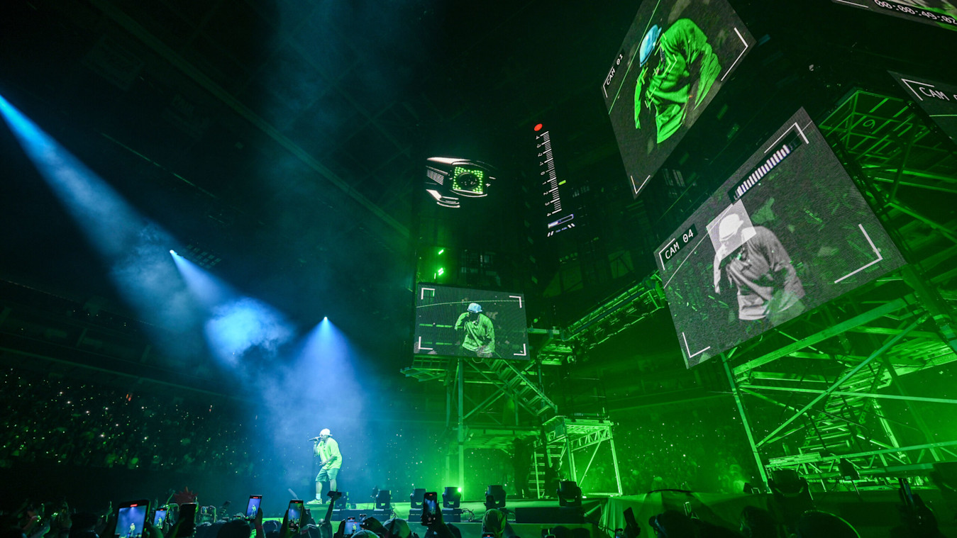 The set—a three-tower, multi-level installation resembling a skeletal city—provided a playground for Feid to run, climb, and dance with his crew. With plenty of screens, digital billboards, and scenic extensions, the Luke Halls team had a highly multifaceted canvas with which to work. They envisioned a journey beginning in a metropolis inspired by Feid’s own Medellín, stylised with towering green skyscrapers and flashing neon to match the singer’s style.