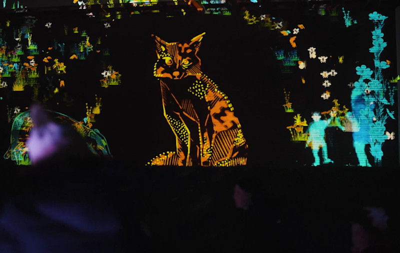 Moment Factory began by creating a physical template comprising seventy-two media bars and forty pixel lines in a sixty-foot-wide scaffolding structure. Technical Directors Julien Roberge and Guillaume Cavalière-Beranek previsualised the structure in Cinema 4D, and the creative team imported that model into Notch and used their horizontal and vertical template as a texture map. This way, they could visualise their content on the 3D light fixtures. Using the show's original soundtrack as a style guide for the mood and rhythm, they crafted a nine-minute animation in After Effects.