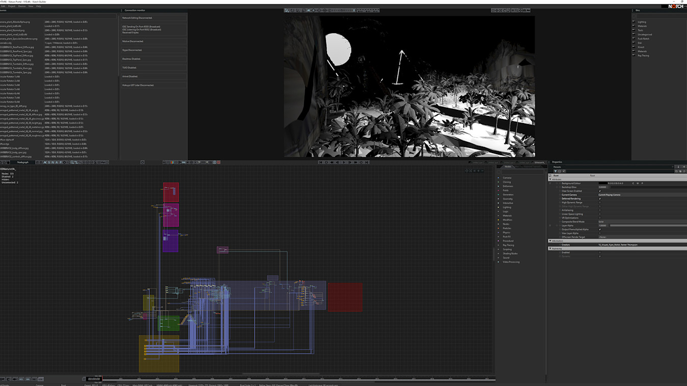 The shows so far have used Kinect cameras to teleport NGHTMRE to otherworldly stages created by Tanner and his team using Notch and C4D. For the virtual Lollapalooza festival, T2 Visuals re-recreated the Chicago skyline using photogrammetry techniques rendered in Notch. A custom Notch x TouchDesigner workflow allowed Tanner dynamic control of the camera moves and NGHTMRE’s lighting designer control of the virtual lights using a physical GrandMA.
