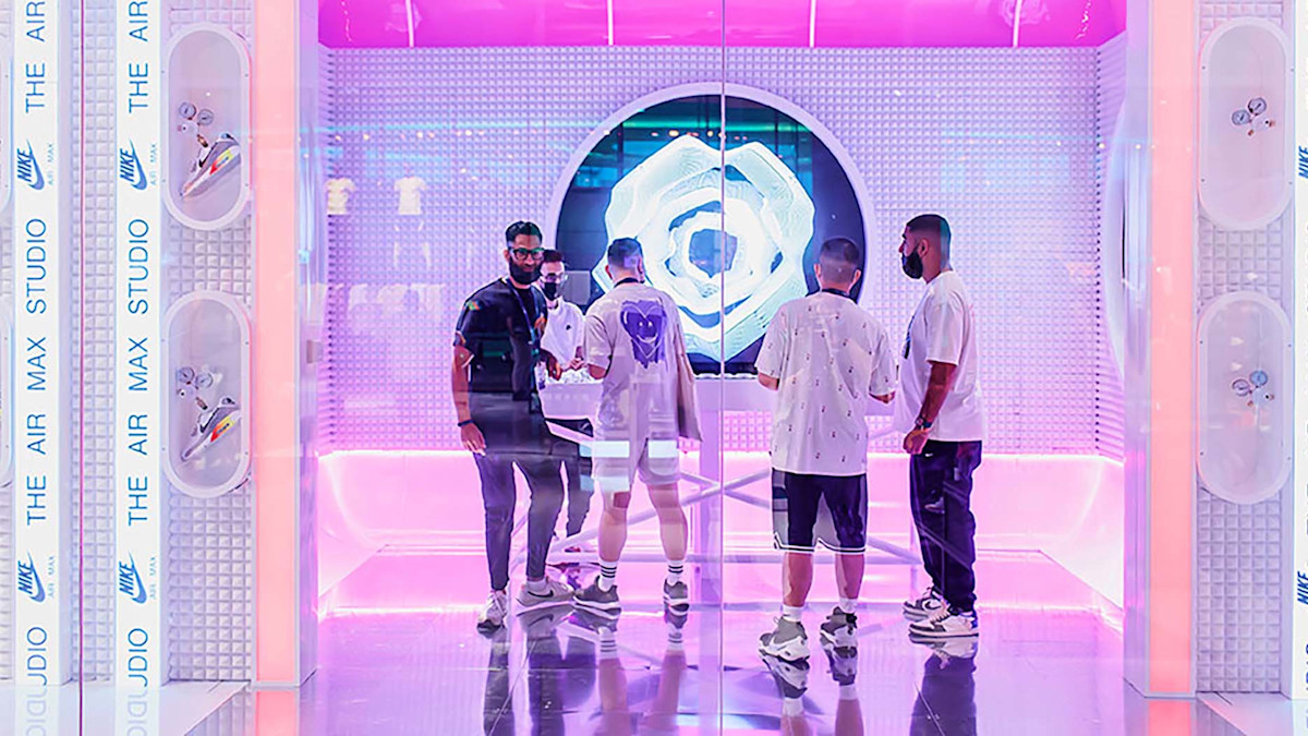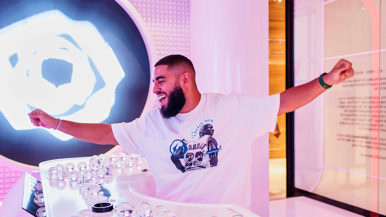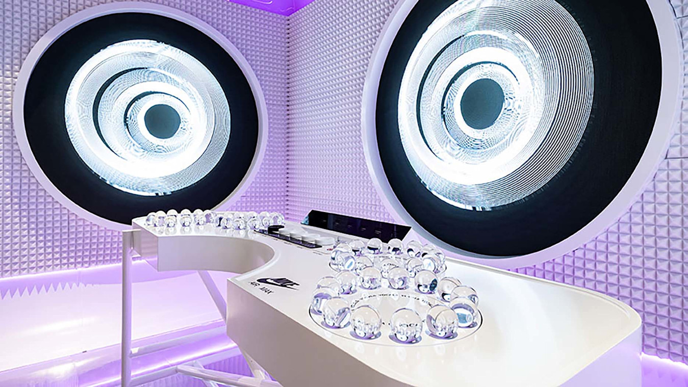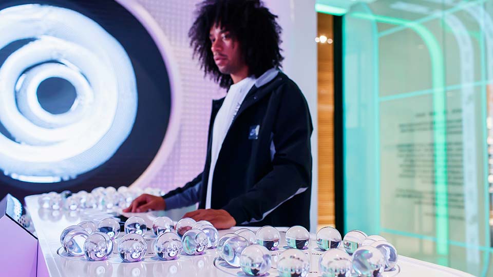 In 2022, Fix8Group commissioned Notch Designer Lorenzo Venturini to create an interactive installation for Nike’s Air Max Day at Dubai Mall. For Interactive Waveform, Fix8Group asked the artist to integrate the prestigious Nike brand into a visual representation of spectator-driven spheres on a table controller at the centre of the exhibition space, the result of which would be a generated visual and musical mix unique to each interaction.