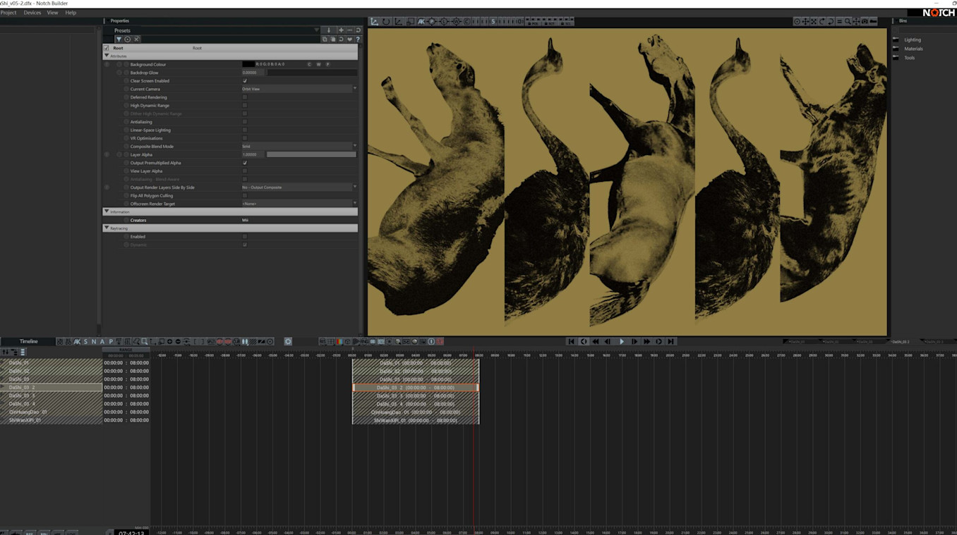 After determining their production plan, the creative team sketched things out in Photoshop and used After Effects for the first stage of their image and video processing. Notch Designers Miii and Kirin Wang then loaded all assets into Notch for individualised structuring and sorting and added different effects, such as segmentation flicker, digital destruction, and Bump Map Warp specifically.