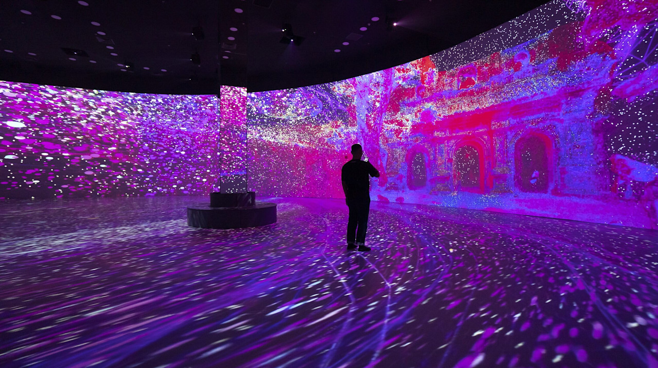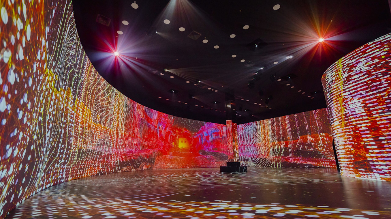 MxC presented three pieces for the space’s soft and grand openings. For the first, MỌI MIỀN TIỀM THỨC, Creative Director Cuong Nguyen used a 360 camera to record scenes of daily life—tombs, bustling markets, narrow alleyways, and street vendors—converted their footage to 3D, used Notch to add particle systems complete with point cloud effects, and transitioned smoothly between images, guiding visitors through flashes of the artist’s memory.