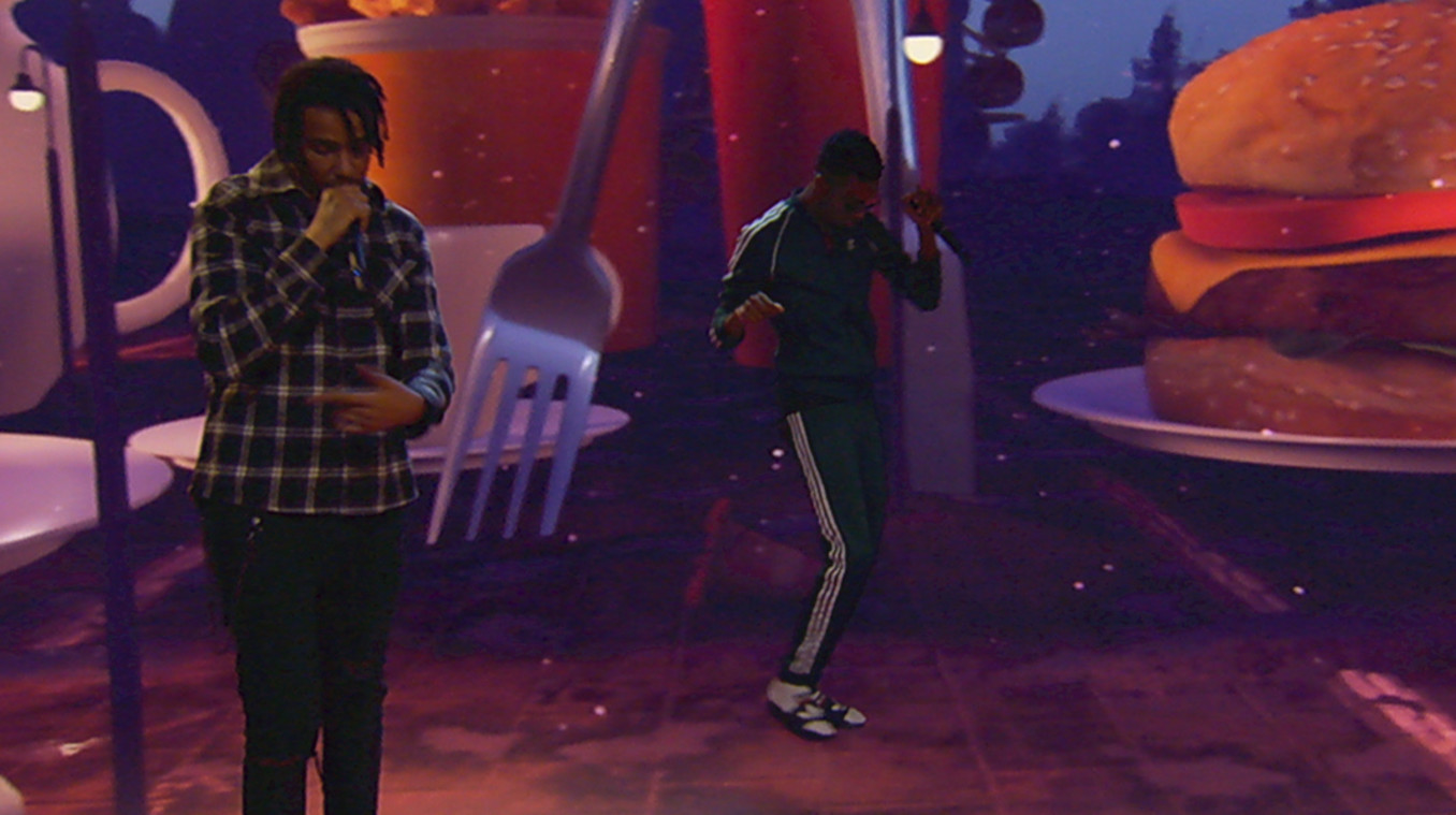 EVOKE chose Notch and the MoSys StarTracker to deliver the production. The presenter environment could capture inbound video, playback motion graphics transitions, and allow for animated off-stage shots of the awards logo. As sponsors of the Pioneer award, EVOKE Studios created a series of worlds for award winner Little Simz performance. Using real-time rendered back and front plate set-extensions, they transported Little Simz from the desert to the depths of the sea. Notch’s real-time render capabilities and ease-of-use both came to the fore when last-minute changes were required. The team was able to react quickly to produce a graphic fast-food inspired scene for a performance from AJ Tracey feat. MoStack’s. The combined result is a cohesive Awards show experience that created a deeper connection between the artists, the lyrics and the at-home viewers.