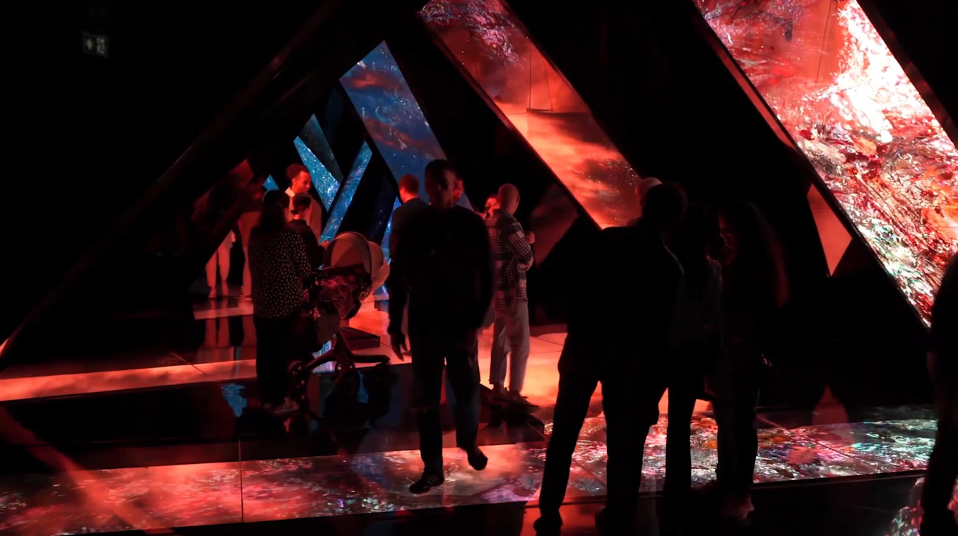 Dubai’s AYA Universe is an immersive experience park depicting an imaginary planet inhabited by alien creatures through twelve unique rooms. First, a room called The Source tells the story of the birth of said creatures in the building’s central dome; later, The River displays the planet’s biomes and natural forces through an interactive floor; finally, Outland shows the creatures taking shape in a journey through different seasons.