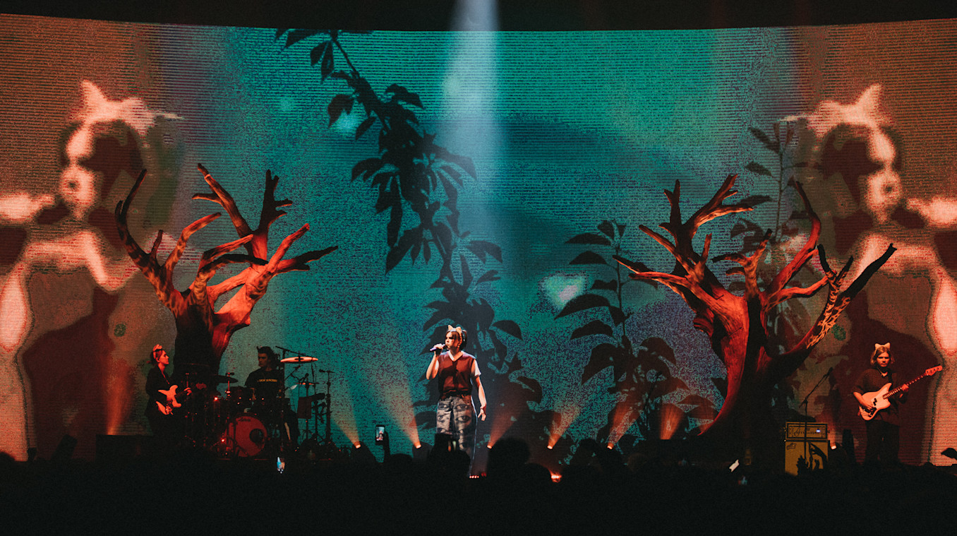 Early on, Ben decided to display both the live video feed and the video content on one large curved screen. With all the video displayed on one main upstage wall, blending the content in unique ways throughout the show was crucial. Ben and Notch designer Ryan Sheppard worked closely with Benee to create IMAG effects that united video footage, animation and live camera feed. From basic colour grading to bodies made up of particle systems, the team used Notch to create artful looks that could blend directly with content in the centre of the screen.