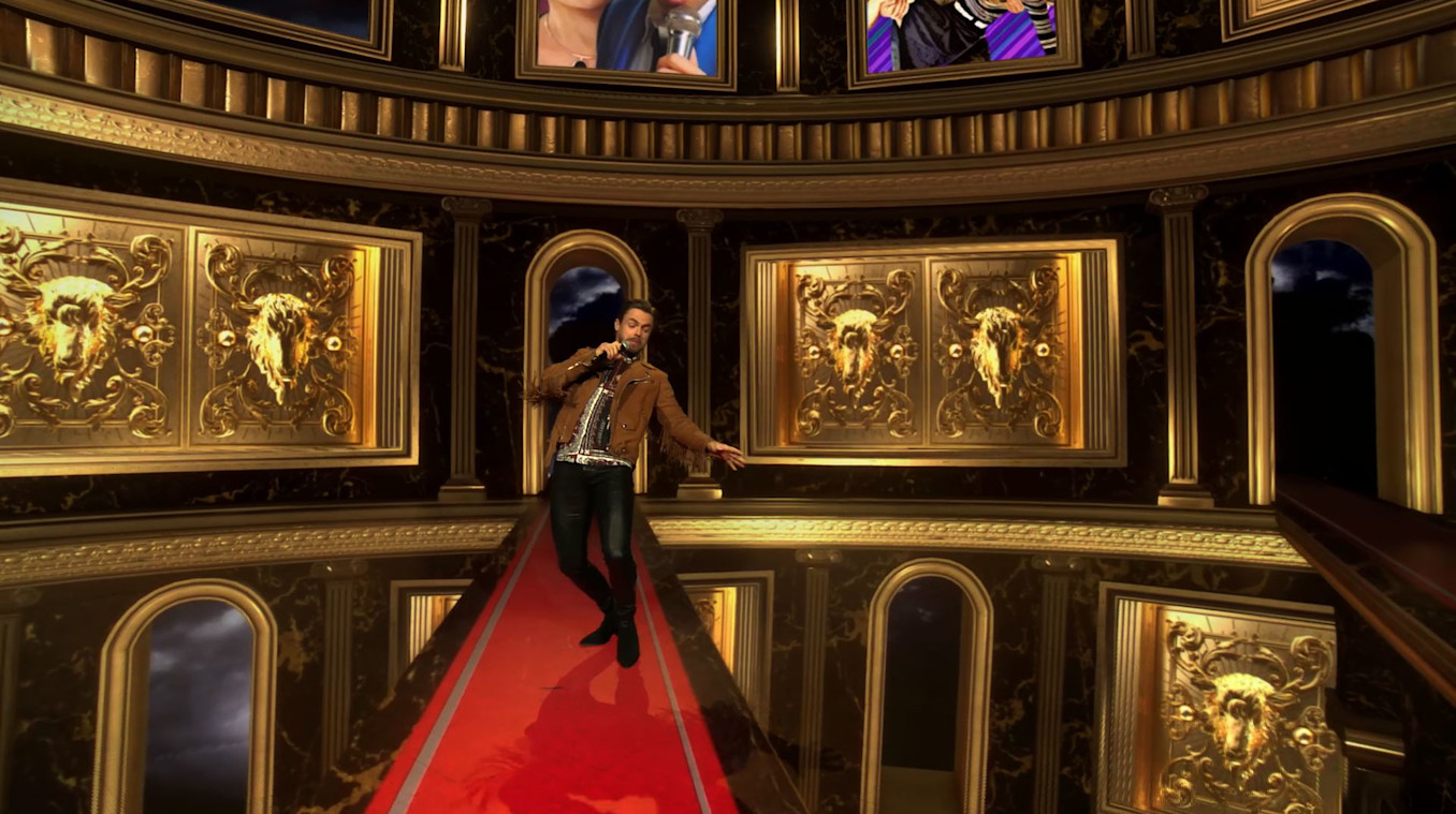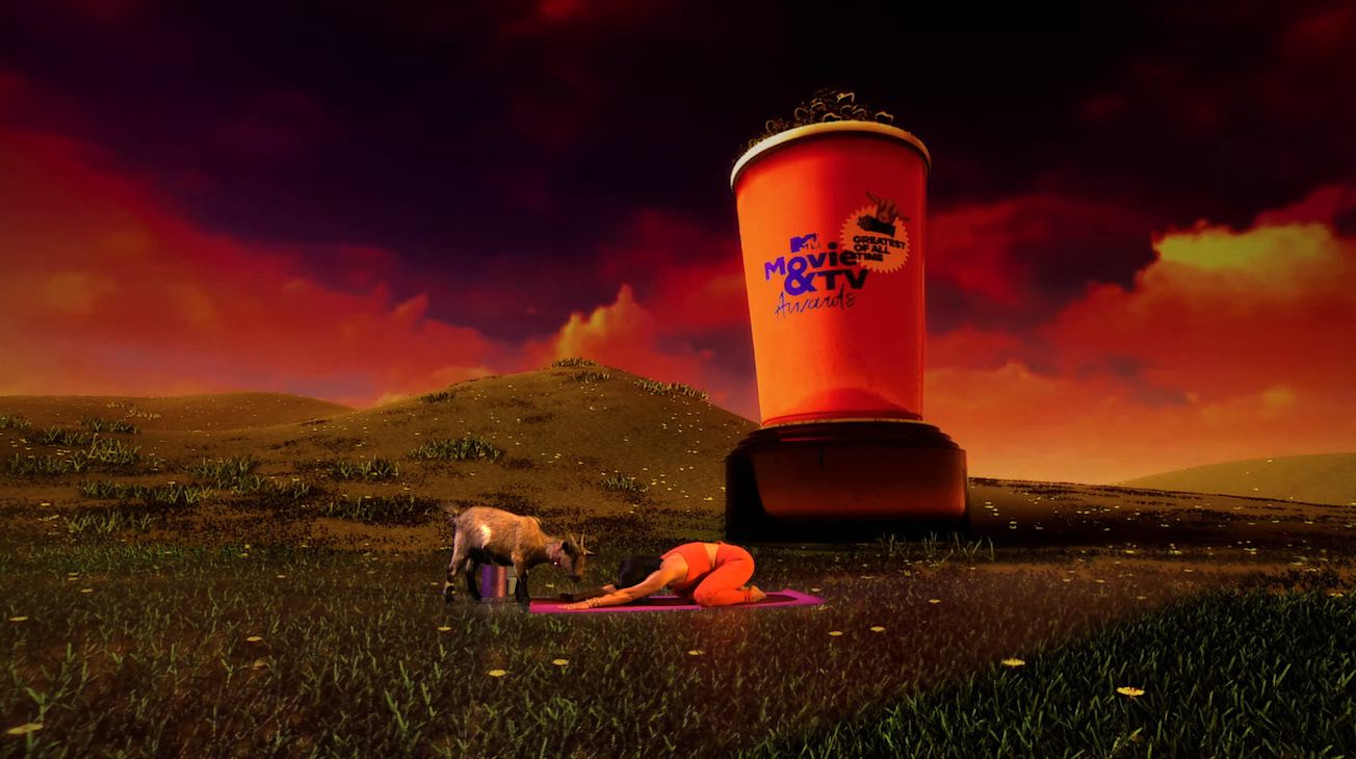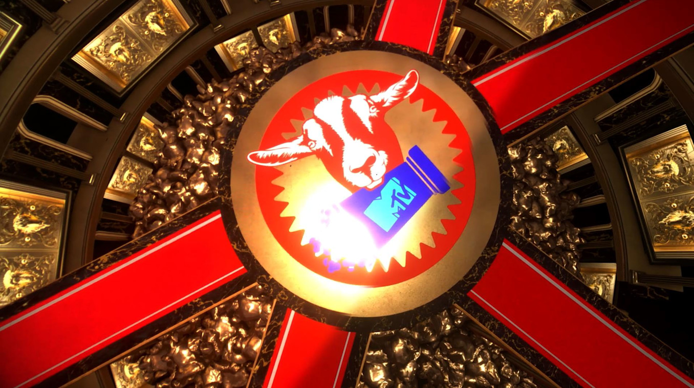 Silent Partners created an opening animation that revealed the iconic MTV Movie & TV Awards trophy in the shape of a popcorn bucket overflowing with golden popped corn. The introduction led the audience through golden goat doors into a tunnel, which reveals the stage - a palatial multi-level room constructed in Notch. Reactive details like animated lighting and a giant goat statue that opened and closed its mouth for host entrances adorned the virtual stage.