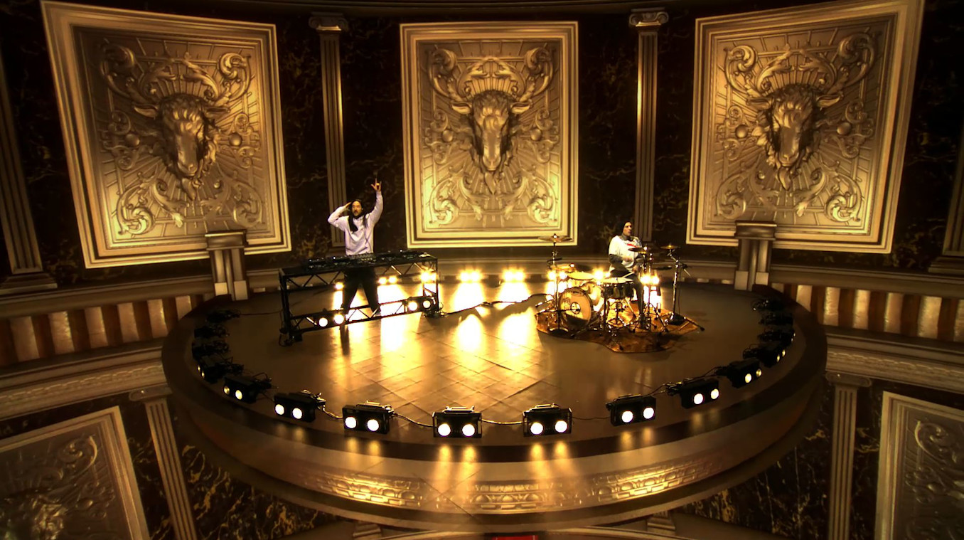 The design featured two distinct performance spaces, and each act received a bespoke virtual lighting design for their performance. Certain musical elements got special treatment with laser-like pans, quick strobes, and full scene lighting hits. The team's playful design approach and virtual production workflow made the creation of this impressive space possible in a short time frame.